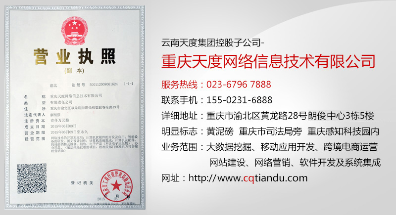 云南天度集團(tuán)控股子公司-重慶天度網(wǎng)絡(luò)信息技術(shù)有限公司于2015年6月9日在重慶市渝北區(qū)注冊(cè)成立,主要從事大數(shù)據(jù)挖掘、移動(dòng)應(yīng)用開(kāi)發(fā)、跨境電商運(yùn)營(yíng)、網(wǎng)站建設(shè)、網(wǎng)絡(luò)營(yíng)銷(xiāo)、軟件開(kāi)發(fā)及系統(tǒng)集成等業(yè)務(wù)。公司位于重慶市渝北區(qū)黃龍路28號(hào)朗俊中心3棟5樓(整層),服務(wù)熱線(xiàn):023-6796 7888