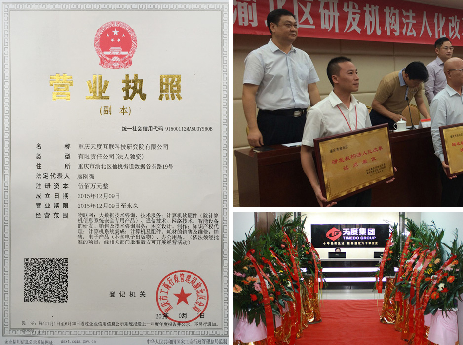 重慶天度互聯(lián)科技研究院(以下簡稱“天度研究院”)于2015年12月正式掛牌成立,這是重慶天度網(wǎng)絡(luò)信息技術(shù)有限公司作為重慶市渝北區(qū)研發(fā)機(jī)構(gòu)法人化試點(diǎn)單位的重要舉措。天度研究院作為集團(tuán)全資成立的獨(dú)立研發(fā)基地,主要以大數(shù)據(jù)、物聯(lián)網(wǎng)、智能硬件、網(wǎng)絡(luò)技術(shù)、電子商務(wù)的研發(fā)和研究為主,并將成立龐大的技術(shù)研發(fā)和產(chǎn)業(yè)研究團(tuán)隊(duì),為集團(tuán)的發(fā)展提供重要技術(shù)支撐。