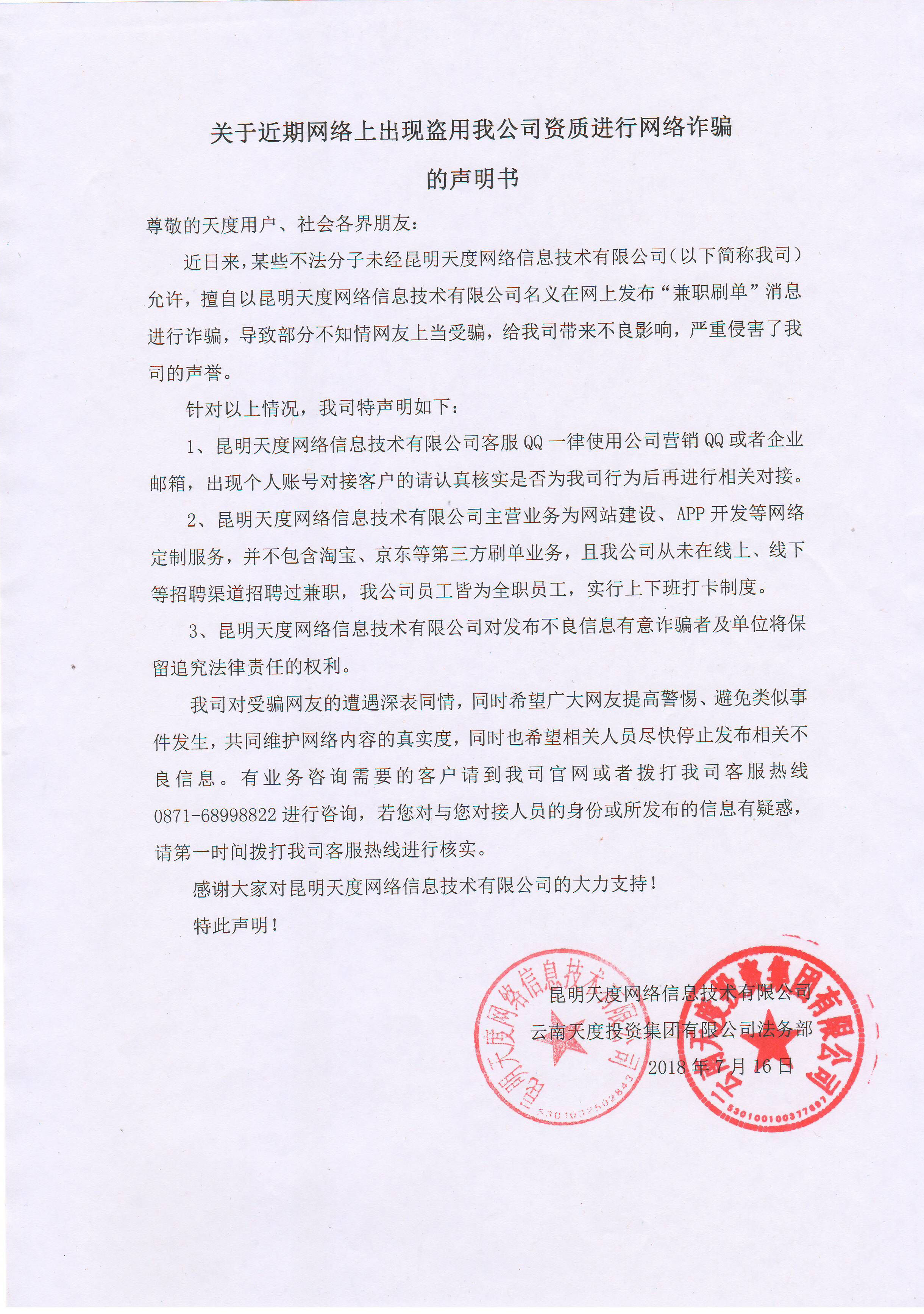 關(guān)于網(wǎng)絡(luò)上盜用我公司資質(zhì)進(jìn)行網(wǎng)絡(luò)詐騙的聲明