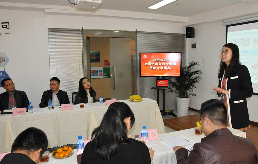 文山州商務(wù)局局長(zhǎng)陶艷,市場(chǎng)體系建設(shè)科、硯山縣、西疇縣、麻栗坡縣、馬關(guān)縣、丘北縣、廣南縣工信商務(wù)局等主要領(lǐng)導(dǎo)共13人蒞臨天度集團(tuán)考察調(diào)研,天度集團(tuán)董事長(zhǎng)鄭桂文、昆明電子商務(wù)協(xié)會(huì)秘書(shū)長(zhǎng)胡曉玲、天度網(wǎng)絡(luò)公司楊副總經(jīng)理、蔚嵐信息技術(shù)有限公司總經(jīng)理陳玉鳳、天度軟件公司總經(jīng)理張羽昊、天度品牌中心負(fù)責(zé)人等參加了本次調(diào)研會(huì)議。雙方就農(nóng)產(chǎn)品供應(yīng)鏈打造、電商培訓(xùn)及宣傳、區(qū)域公共品牌培育、電商大數(shù)據(jù)中心等進(jìn)行了調(diào)研和交流。