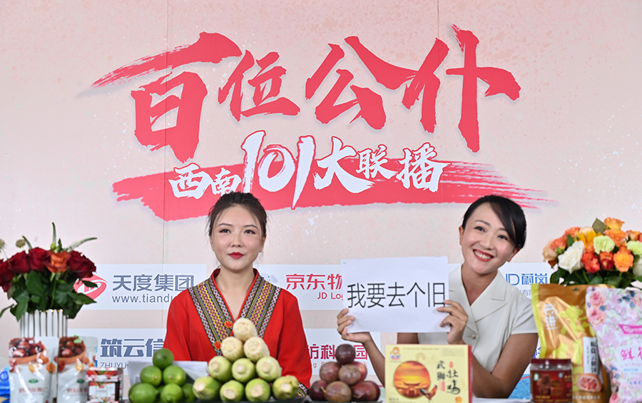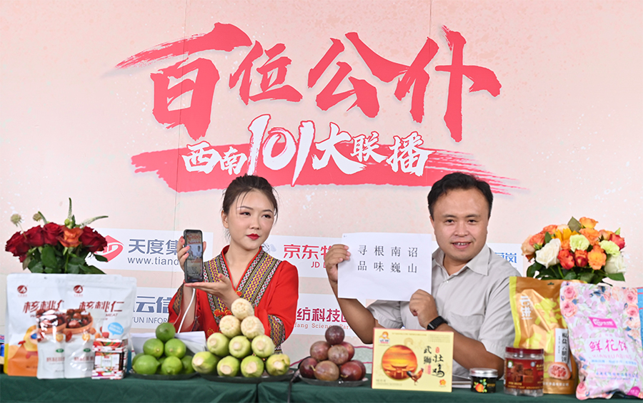 6月17日下午,“百位公仆,西南101大聯(lián)播”大型助農(nóng)直播活動在云紡科技園直播基地舉行,來自云南巍山、南澗、水富、個舊、開遠(yuǎn)、彝良、武定、景東、景谷等縣(市)的11位副縣(市)長,與四川知名電視主持人、直播記者郭秀一同走進(jìn)直播間,同框出鏡,為云南各地好貨代言,推動農(nóng)產(chǎn)品推廣上行,助力脫貧攻堅。近3小時的直播中,特色的農(nóng)產(chǎn)品、實惠的價格,以及豐厚的贈品吸引了260多萬網(wǎng)友圍觀。