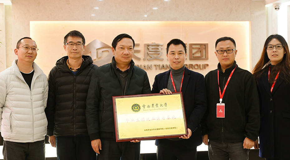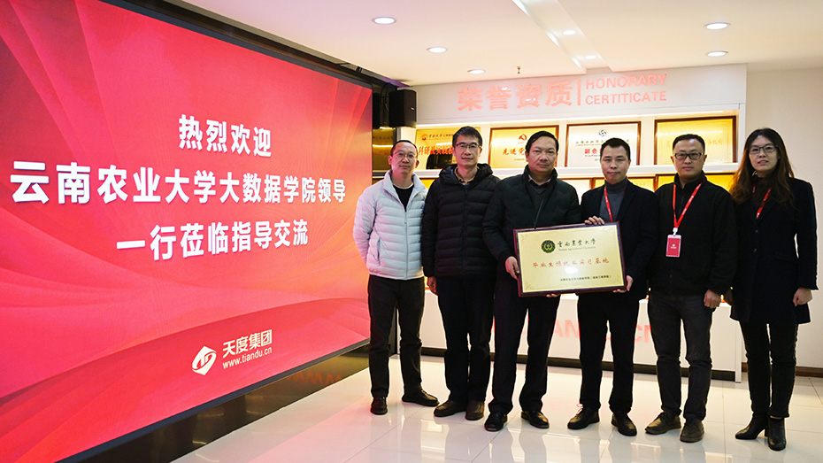 云南農(nóng)業(yè)大學煙草學院黨委書記李作森,大數(shù)據(jù)學院(信息工程學院)黨委書記王燦宇,副院長楊建平,副書記趙紅波等領(lǐng)導一行到天度集團總部指導交流,雙方就校企合作、就業(yè)實習等領(lǐng)域合作達成意向并現(xiàn)場簽署《合作協(xié)議》,云南農(nóng)業(yè)大學大數(shù)據(jù)學院向天度集團進行“畢業(yè)生預就業(yè)實習基地”授牌。
