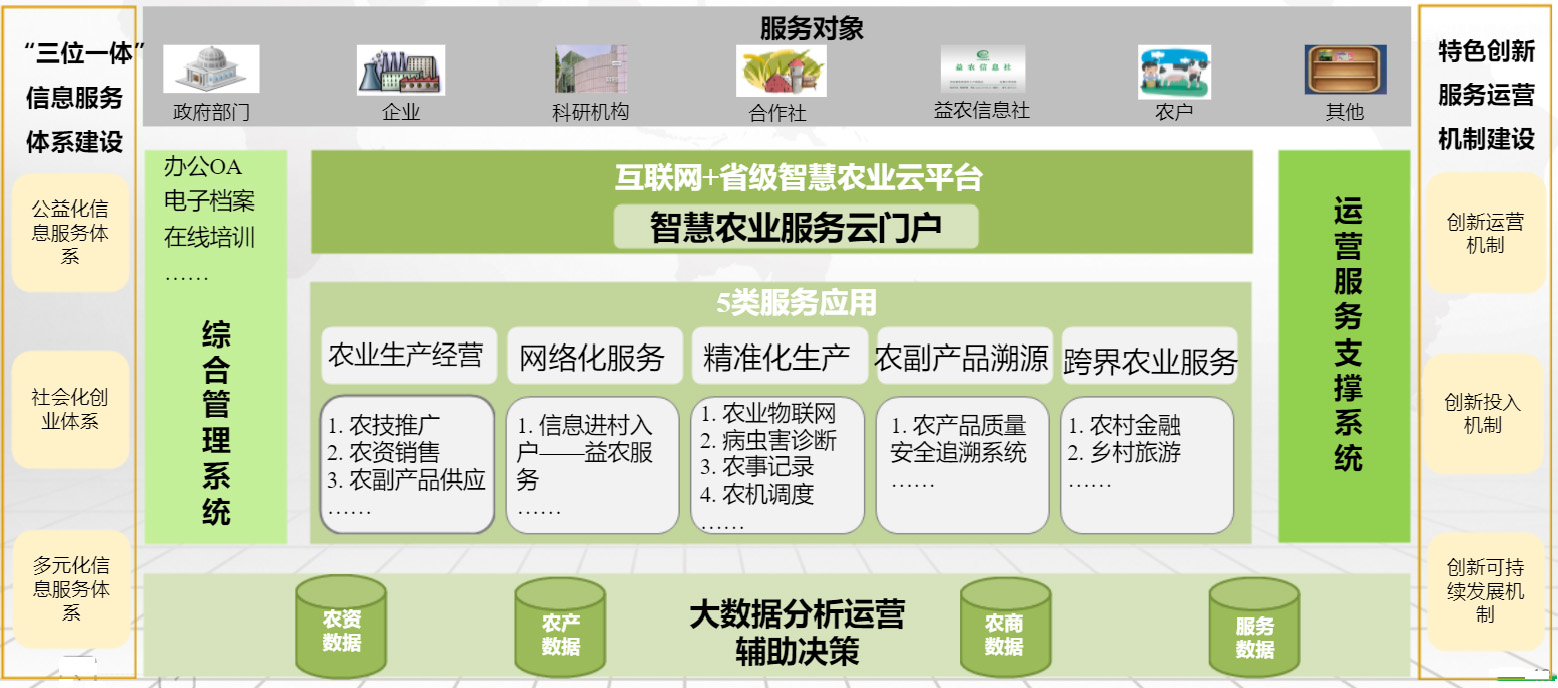 以農(nóng)業(yè)資源為基礎(chǔ)、市場(chǎng)為導(dǎo)向、效益為中心、產(chǎn)業(yè)化為抓手,面向農(nóng)業(yè)管理部門(mén)、農(nóng)技推廣部門(mén)、農(nóng)業(yè)企業(yè)、農(nóng)業(yè)園區(qū)/基地、農(nóng)業(yè)專(zhuān)家、農(nóng)民等多層次用戶(hù)體系,充分利用計(jì)算機(jī)與網(wǎng)絡(luò)技術(shù)、物聯(lián)網(wǎng)技術(shù)、音視頻技術(shù)、無(wú)線通信技術(shù)、大數(shù)據(jù)技術(shù)、云計(jì)算及專(zhuān)家智慧與知識(shí),集成傳感器、土壤墑情采集站、監(jiān)控視頻頭、水肥藥一體機(jī)、太陽(yáng)能氣象站、太陽(yáng)能捕蟲(chóng)儀、太陽(yáng)能電磁閥、智能手機(jī)等智能化自動(dòng)化設(shè)備,建設(shè)以農(nóng)產(chǎn)品質(zhì)量安全、農(nóng)資安全監(jiān)管、農(nóng)業(yè)區(qū)域資源為主的監(jiān)管平臺(tái),以種植指導(dǎo)、病蟲(chóng)害防治、標(biāo)準(zhǔn)化生產(chǎn)、農(nóng)業(yè)物聯(lián)網(wǎng)、農(nóng)業(yè)生產(chǎn)診斷決策為主的生產(chǎn)管理平臺(tái),以及以農(nóng)業(yè)資訊、農(nóng)產(chǎn)品價(jià)格走勢(shì)、農(nóng)產(chǎn)品交易、營(yíng)銷(xiāo)推廣、質(zhì)量溯源、植物醫(yī)院、農(nóng)技推廣服務(wù)、人力資源服務(wù)為主的信息服務(wù)平臺(tái),實(shí)現(xiàn)更完備的信息化基礎(chǔ)支撐、更集中的數(shù)據(jù)資源、更深入的政府監(jiān)管、更先進(jìn)的生產(chǎn)管理、更貼心的公眾服務(wù),實(shí)現(xiàn)農(nóng)業(yè)生產(chǎn)、監(jiān)管、服務(wù)一體化支撐,以及農(nóng)業(yè)農(nóng)村全方位、全過(guò)程的信息化、智慧化管理,達(dá)到信息技術(shù)與產(chǎn)業(yè)發(fā)展的和諧提升,推動(dòng)現(xiàn)代農(nóng)業(yè)快速發(fā)展。