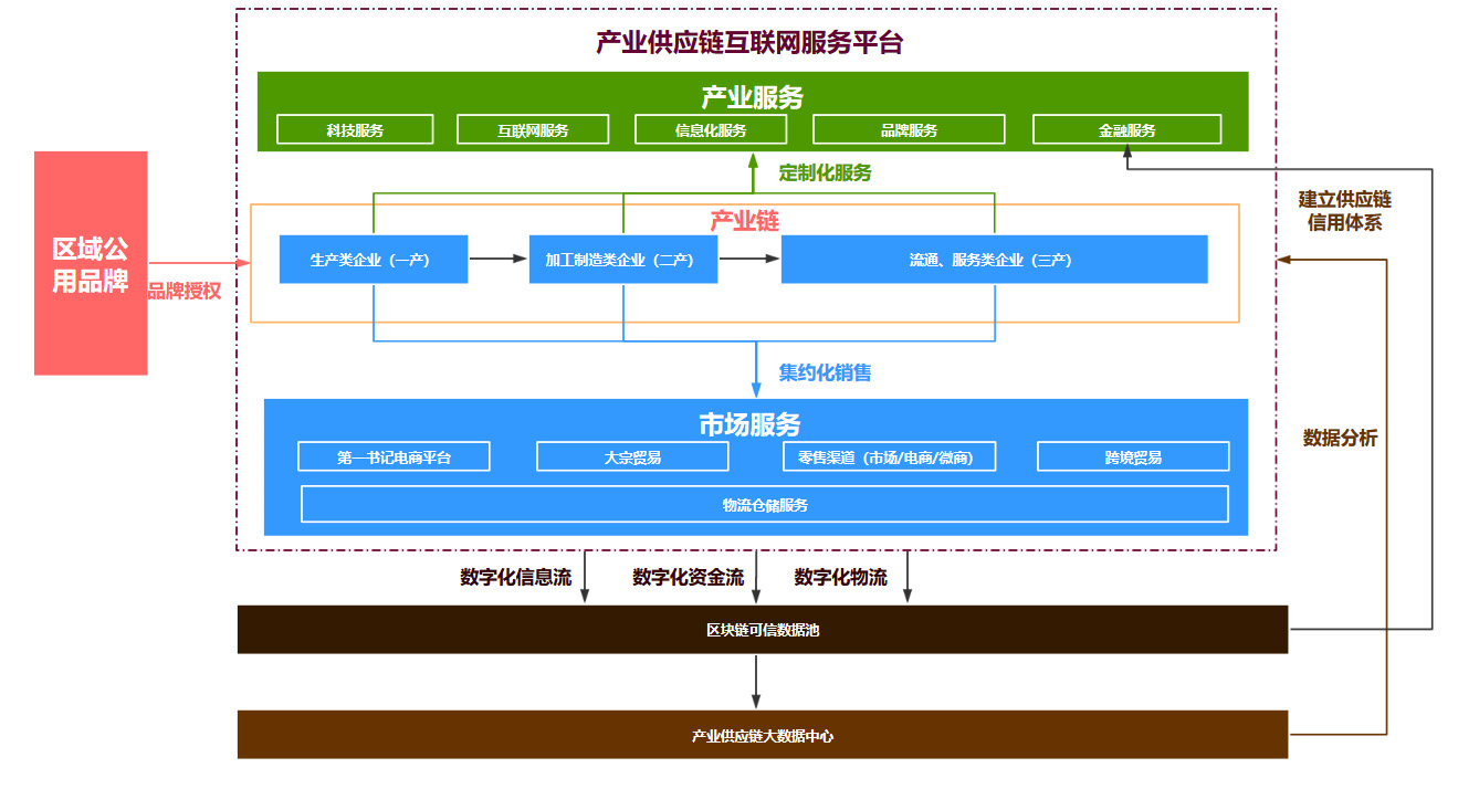 數(shù)字化供應(yīng)鏈服務(wù)平臺(tái)應(yīng)立足區(qū)域傳統(tǒng)產(chǎn)業(yè)、優(yōu)勢產(chǎn)業(yè)及重點(diǎn)支柱產(chǎn)業(yè),將電子商務(wù)將與發(fā)展需求充分結(jié)合,建立線上線下一體化的服務(wù)體系。平臺(tái)將區(qū)域品牌化體系建設(shè)為產(chǎn)業(yè)標(biāo)準(zhǔn)入口,服務(wù)于供應(yīng)鏈內(nèi)各企業(yè)主體,貫穿產(chǎn)業(yè)鏈從生產(chǎn)端、加工制造端、流通端全鏈條,以提升供應(yīng)鏈各主體協(xié)同效率。同時(shí),平臺(tái)以數(shù)字化為核心手段及時(shí)獲取供應(yīng)鏈信息流、物流、資金流等數(shù)據(jù),并基于區(qū)塊鏈技術(shù)建立一套產(chǎn)業(yè)可信數(shù)據(jù)池,應(yīng)用大數(shù)據(jù)分析技術(shù)對供應(yīng)鏈進(jìn)行動(dòng)態(tài)分析,最終實(shí)現(xiàn)智慧化供應(yīng)鏈系統(tǒng),成為基于數(shù)字化供應(yīng)鏈的集約化、智能化、創(chuàng)新性的開放式產(chǎn)業(yè)生態(tài)平臺(tái),以市場化、數(shù)據(jù)化、智慧化的運(yùn)營方式促進(jìn)產(chǎn)業(yè)升級(jí),創(chuàng)造價(jià)值與財(cái)富。