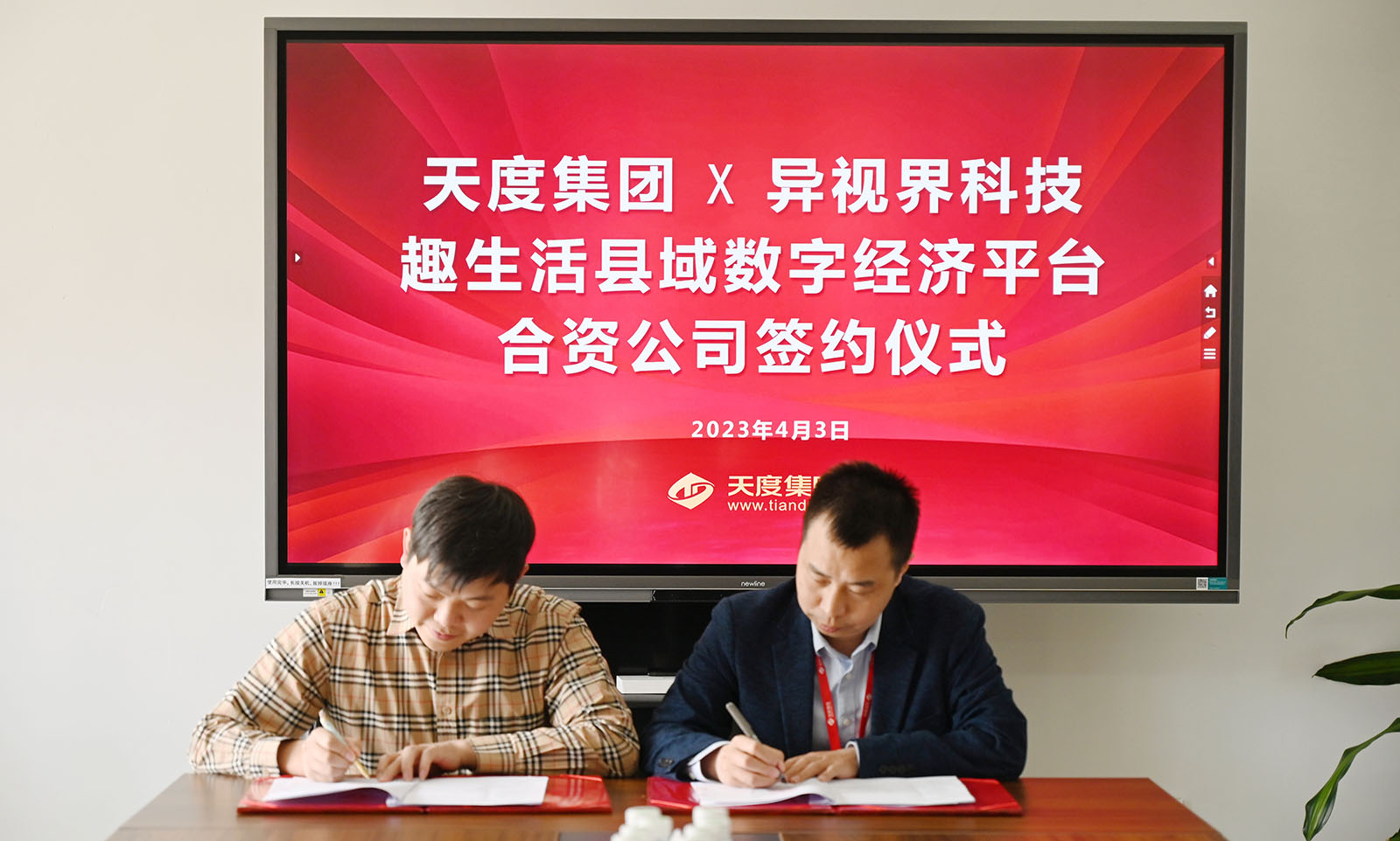 4月3日下午,天度集團(tuán)投資“云趣生活”縣域數(shù)字經(jīng)濟(jì)平臺(tái)建設(shè)項(xiàng)目簽約儀式在集團(tuán)總部舉行,云南天度投資集團(tuán)有限公司董事長(zhǎng)鄭桂文與昆明異視界科技有限公司董事長(zhǎng)李學(xué)貴代表雙方在協(xié)議上簽字。