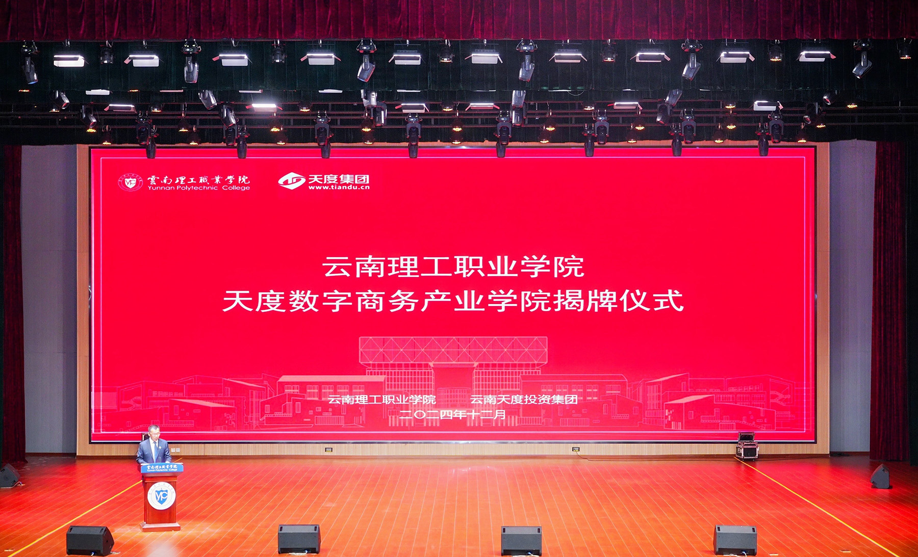 12月5日,云南理工職業(yè)學(xué)院天度數(shù)字商務(wù)產(chǎn)業(yè)學(xué)院簽約揭牌儀式在學(xué)生會(huì)堂隆重舉行。此次簽約標(biāo)志著云南理工職業(yè)學(xué)院與云南天度投資集團(tuán)強(qiáng)強(qiáng)聯(lián)手,共同開啟職業(yè)教育產(chǎn)教融合新篇章。