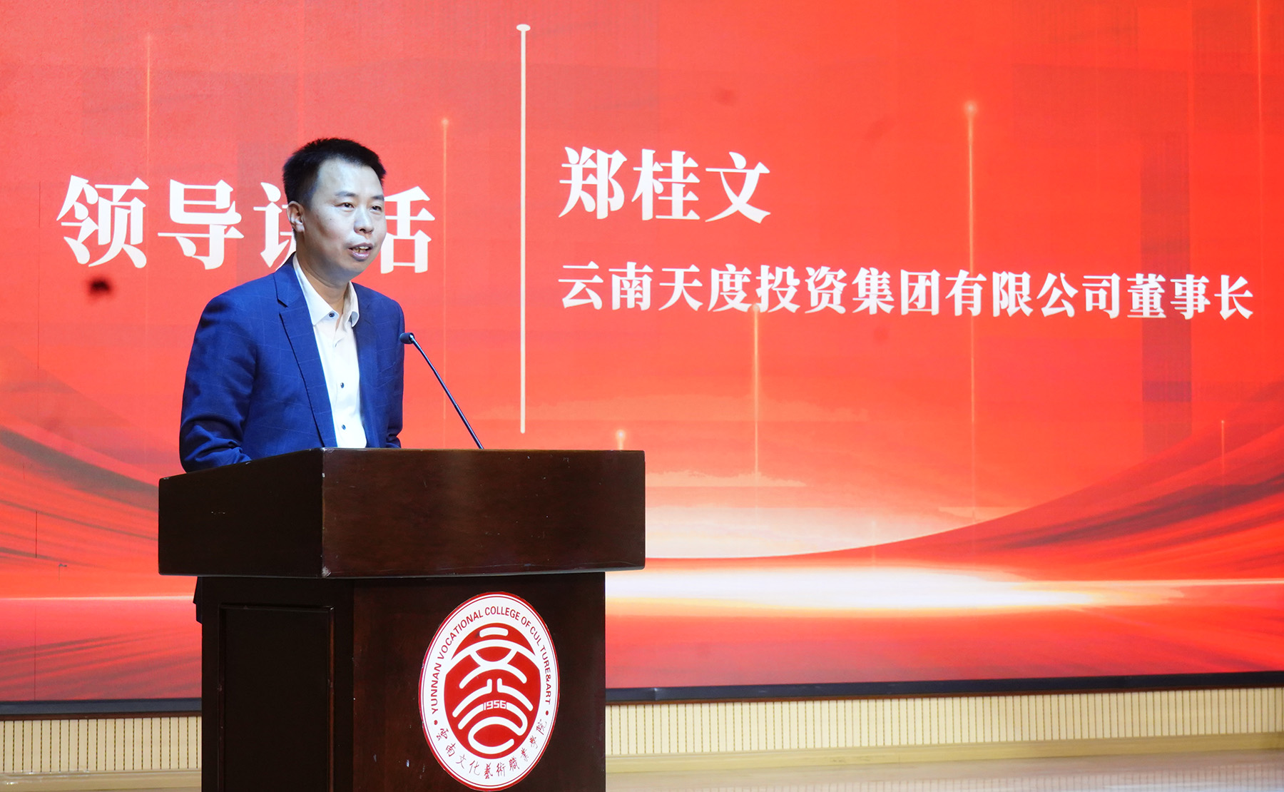 鄭桂文董事長(zhǎng)在致辭中表示,此次合作是校企雙方貫徹落實(shí)國(guó)家職業(yè)教育改革政策、深化產(chǎn)教融合的重要舉措,也是天度集團(tuán)踐行“以產(chǎn)業(yè)反哺教育、以教育賦能未來(lái)”使命的重要一步。天度集團(tuán)將發(fā)揮其作為區(qū)域數(shù)字經(jīng)濟(jì)龍頭企業(yè)所擁有大數(shù)據(jù)研究院、博士后科研工作站等技術(shù)資源優(yōu)勢(shì),以及深耕數(shù)字經(jīng)濟(jì)20年的產(chǎn)業(yè)優(yōu)勢(shì),與學(xué)校共同聚焦融媒體技術(shù)與運(yùn)營(yíng)、人工智能技術(shù)應(yīng)用、軟件技術(shù)、信息安全應(yīng)用技術(shù)等相關(guān)專業(yè),通過(guò)“共建共管”模式深化產(chǎn)教融合,圍繞數(shù)字經(jīng)濟(jì)、文旅融合等重點(diǎn)產(chǎn)業(yè)發(fā)展需求,共同建設(shè)校內(nèi)外實(shí)訓(xùn)基地,克隆企業(yè)真實(shí)研發(fā)環(huán)境,構(gòu)建專業(yè)集群交叉矩陣,共同制定專業(yè)發(fā)展規(guī)劃,定期評(píng)估產(chǎn)業(yè)趨勢(shì),動(dòng)態(tài)優(yōu)化課程體系,保持教學(xué)內(nèi)容與產(chǎn)業(yè)發(fā)展同步,實(shí)現(xiàn)“產(chǎn)業(yè)需求進(jìn)大綱、技術(shù)標(biāo)準(zhǔn)進(jìn)課堂、真實(shí)項(xiàng)目進(jìn)實(shí)訓(xùn)”,合力打造精準(zhǔn)適配市場(chǎng)需求的特色專業(yè)集群,培養(yǎng)數(shù)字經(jīng)濟(jì)領(lǐng)域高素質(zhì)技術(shù)技能型人才,賦能區(qū)域數(shù)字經(jīng)濟(jì)、文旅融合等重點(diǎn)產(chǎn)業(yè)發(fā)展。鄭董事長(zhǎng)還強(qiáng)調(diào)指出,希望通過(guò)此次合作,雙方將進(jìn)一步推動(dòng)成立產(chǎn)業(yè)學(xué)院并使其成為云南文化藝術(shù)產(chǎn)業(yè)數(shù)字化的“創(chuàng)新引擎”,讓每一位學(xué)子在這里找到“用技術(shù)守護(hù)文化、用創(chuàng)意點(diǎn)亮人生”的舞臺(tái)!共同書寫產(chǎn)教融合的新篇章,為云南乃至全國(guó)的數(shù)字經(jīng)濟(jì)及文旅融合產(chǎn)業(yè)注入新的活力與動(dòng)能!