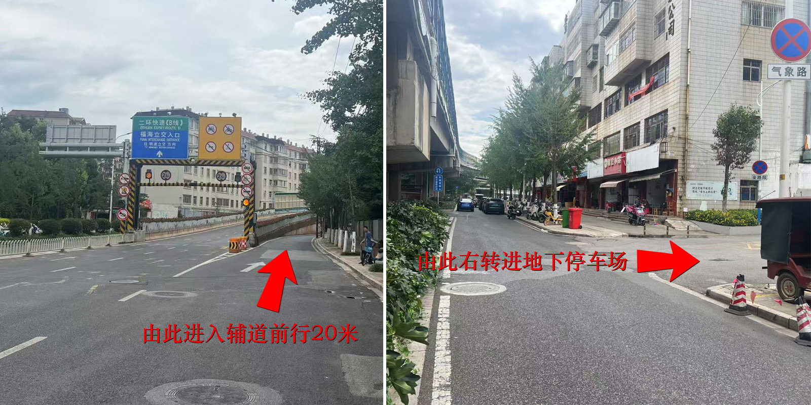 開車路線導(dǎo)航:請沿著氣象路上二環(huán)方向,按左上圖所示走輔道(不要上高架)前行20米,按右上圖所示右轉(zhuǎn)下地下停車場,進(jìn)入停車場急左轉(zhuǎn)直行下一層進(jìn)入負(fù)三樓,在A4棟(A座寫字樓)電梯口(天度集團(tuán)專用停車位,旁邊有值班人員)停車,然后坐電梯至8樓。
